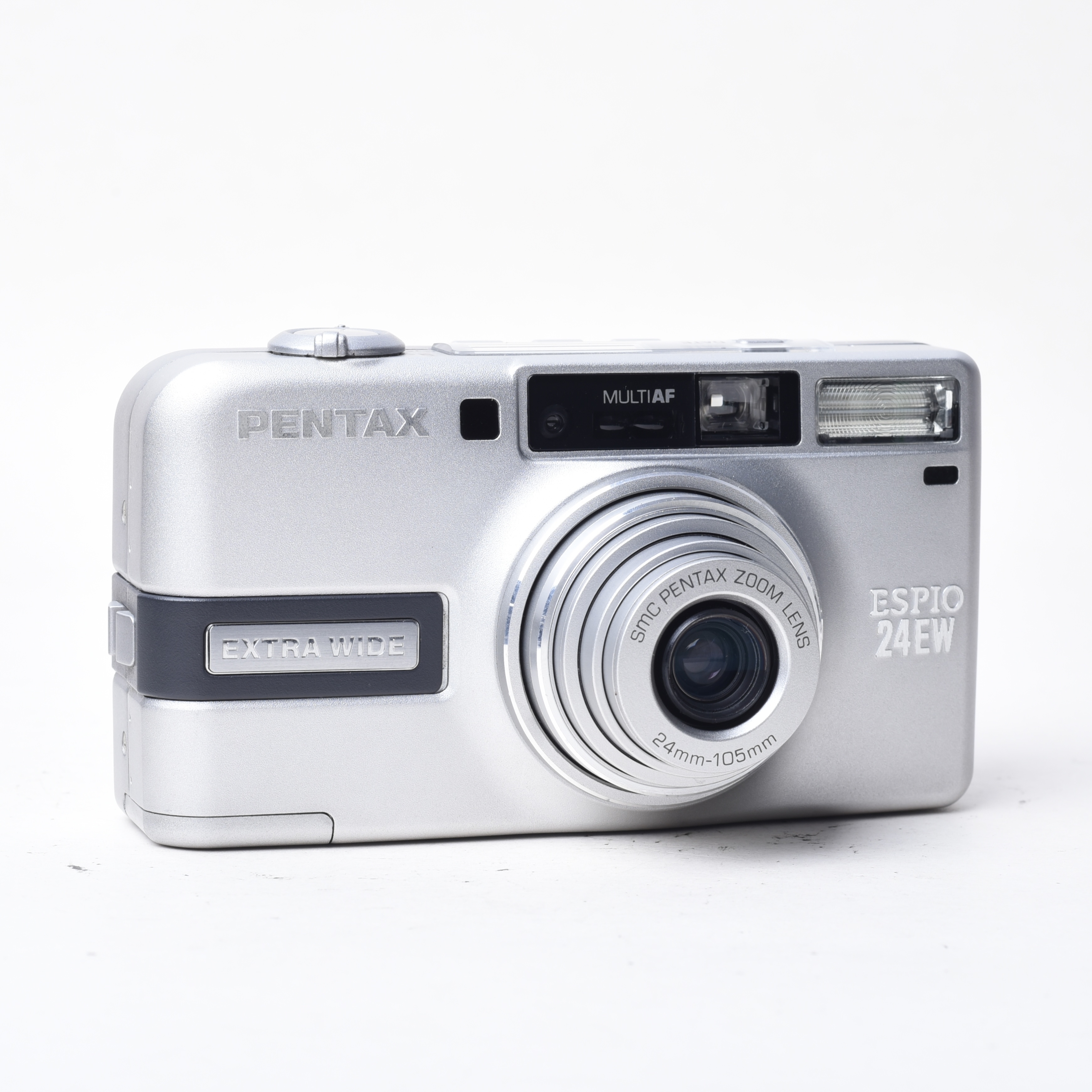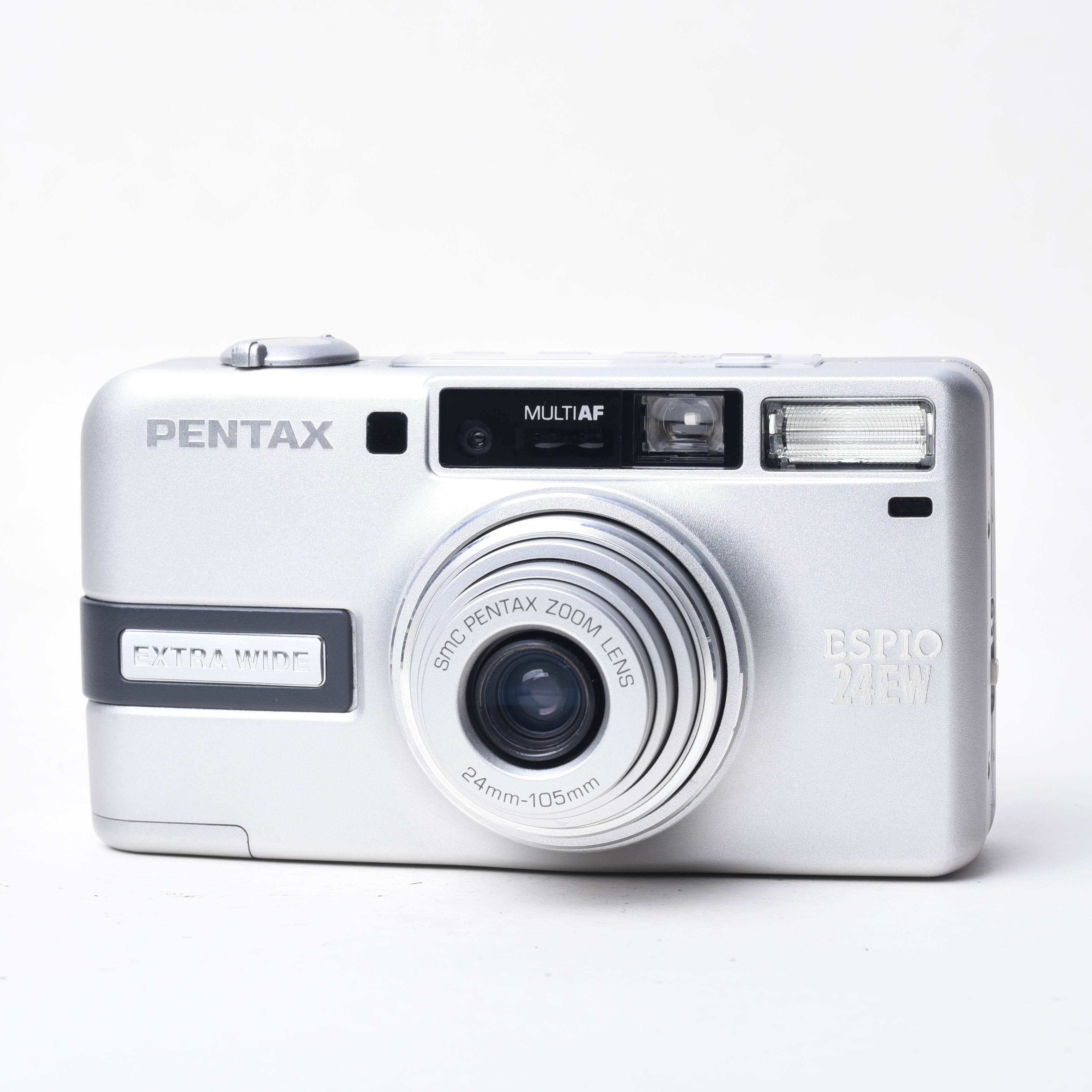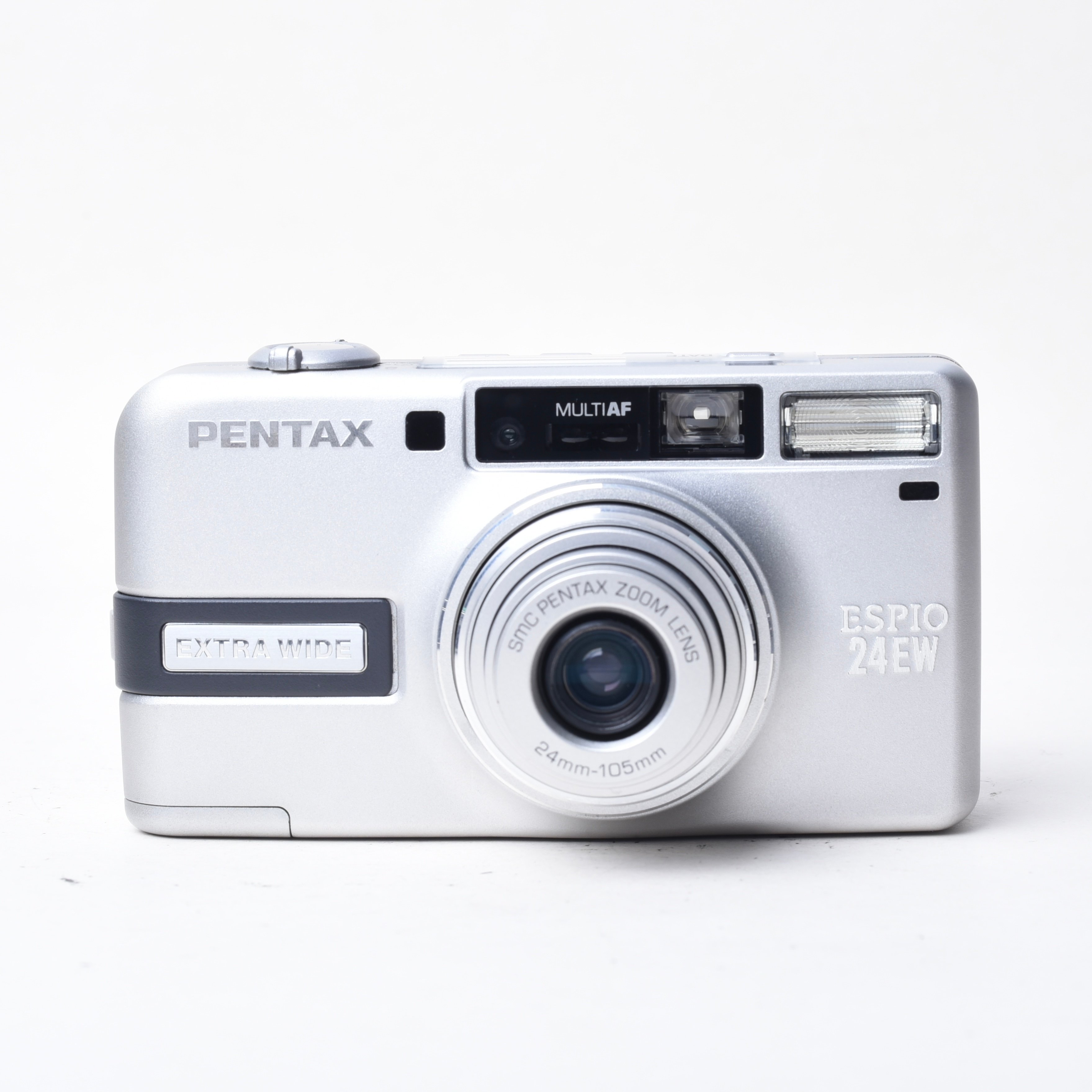 Pentax Espio 24EW 是一款經典的 35mm 膠片相機,以下是其主要特點的列表簡介: • 類型:35mm 全自動鏡頭快門相機,內置變焦鏡頭、自動對焦、自動曝光和自動閃光。  • 鏡頭:SMC Pentax 電源變焦 24mm-105mm 鏡頭,4.4 倍變焦,提供 24mm 超廣角視角。   • 對焦系統:7 點被動自動對焦系統,支持點測 AF 和無限遠對焦鎖定。   • 曝光:自動曝光,支持曝光補償(+/- 3EV,以 1/2 檔增量)。   • ISO 範圍:25-3200,支持 DX 編碼膠片。   • 閃光:自動閃光,支持軟閃光模式。  • 拍攝模式:肖像模式、微距拍攝(最近對焦距離支持近拍)。  • 其他功能:電子快門、自動膠片前進、日期印記(QD 版本)。   • 發布與狀態:於 2002 年發布,已停產,但適合點拍攝愛好者使用。
